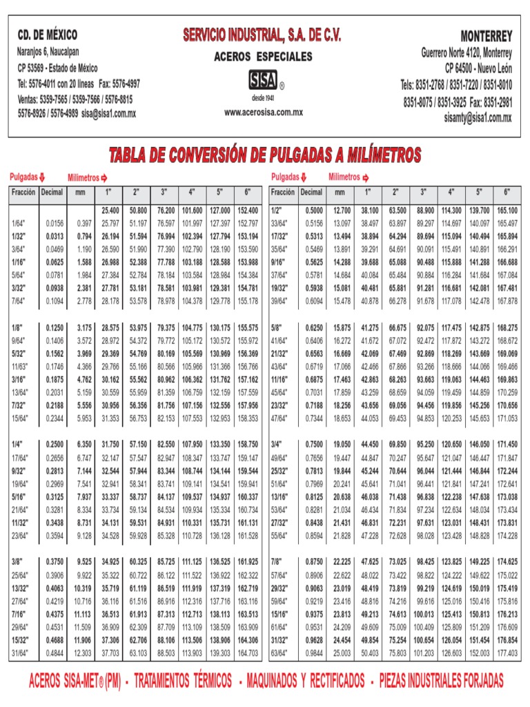Tabla De Conversion Milimetros A Pulgadas Pdf